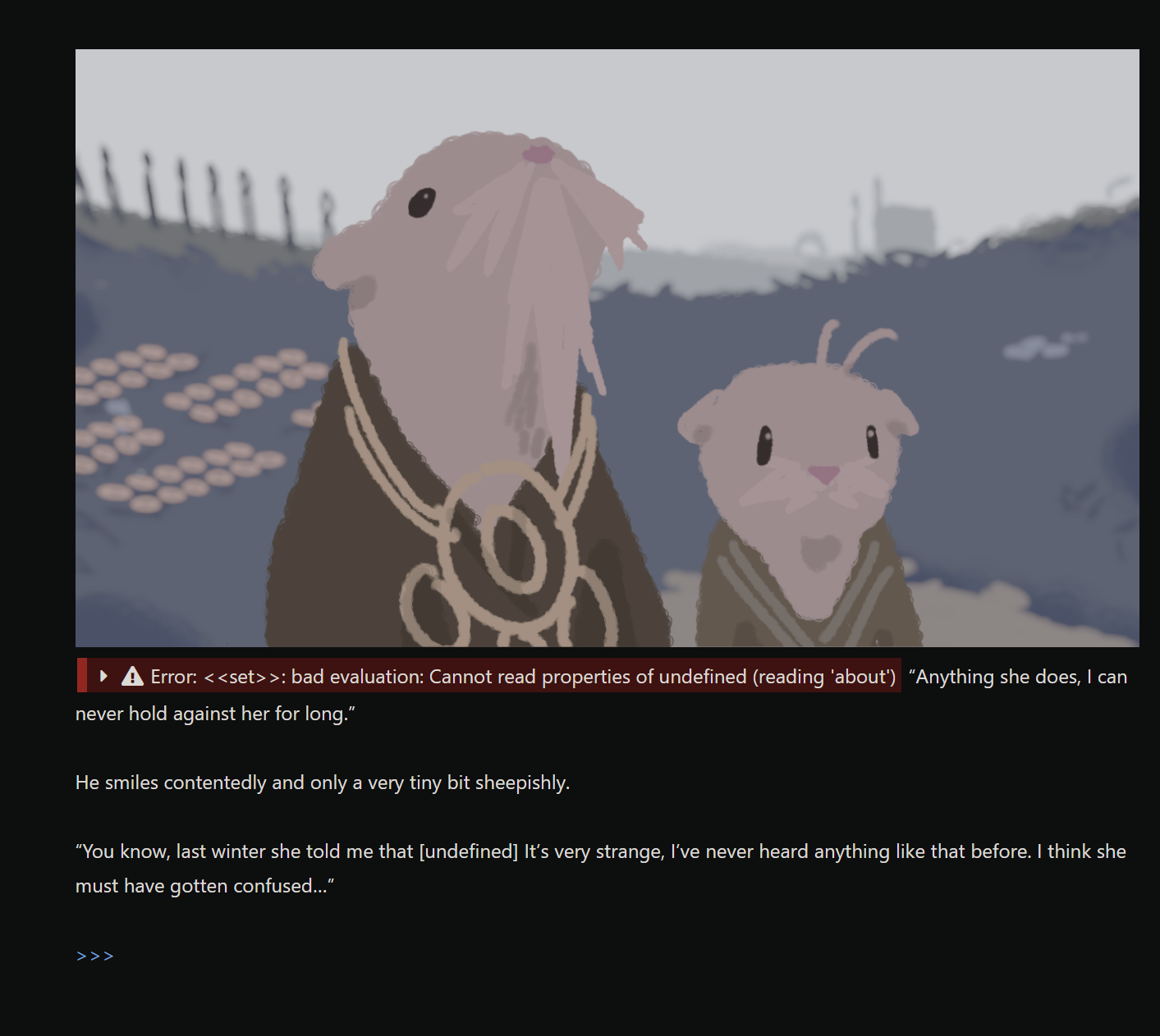 Overall, I think I've done enough kludging verbs and nouns together (adventure game-style) that it's safe to say I'm stuck for the moment. I enjoyed the worldbuilding and the process, but I think a couple more hints could be dropped, or a little more signposting done, as past the more "obvious" unlocks I'm not quite sure how to progress - I've never been able to figure out how to leverage the revelation that certain characters are married but one is rumoured to be fooling around with someone else, for example. I did figure out that you can trigger *more* verbs to appear under certain circumstances, but one in particular (regarding what the Honey told me about the Wyrmhandler) I can only ever get to trigger on my second year and tell exclusively to the Monk, which does unlock unique dialogue but doesn't seem to affect anything/give me knowledge in a way I could carry forward.